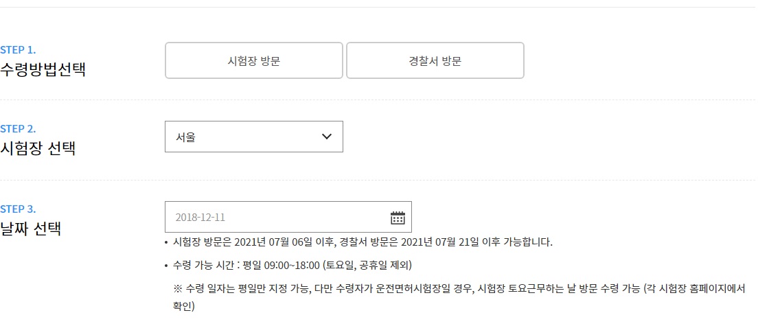 수령 방법은 '시험장'과 '경찰서 방문'이 있습니다. 안내에도 나와있지만, 날짜 선택에 제한이 있으므로, 본인 스케줄을 고려해서 날짜 선택하시고 방문만 하시면 되겠습니다. 평소 바빠서 시간이 안되는 사람들은 이렇게 날짜를 지정하고 결제까지 완료한 다음, 원하는 곳에서 수령하시면 되겠습니다.