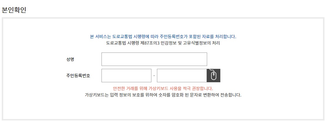 본인 확인을 해줍니다. 신분증인 만큼 본인 이름과 주민 등록번호를 정확히 입력하시는 절차가 필요합니다.