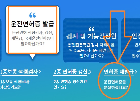 '운전 면허증 발급'에 대한 메뉴가 있습니다. 여기서 사진을 보시면, '면허증 재발급' 부분에 동그라미 쳐진 거 보이실 겁니다. 거기를 눌러봅니다.