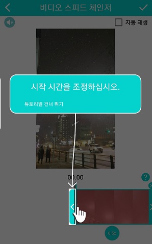 어플을 들어가고 동영상을 선택하면 처음에 알아서 설명을 제공합니다. 첫번째는 속도 시간 선택기를 추가하는 것입니다. 빨리 감기를 하려면 먼저 타임라인을 길게 눌러 시간 선택기를 불러옵니다.