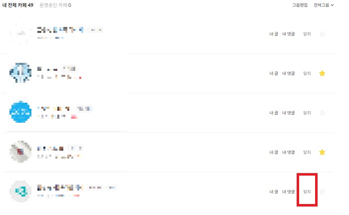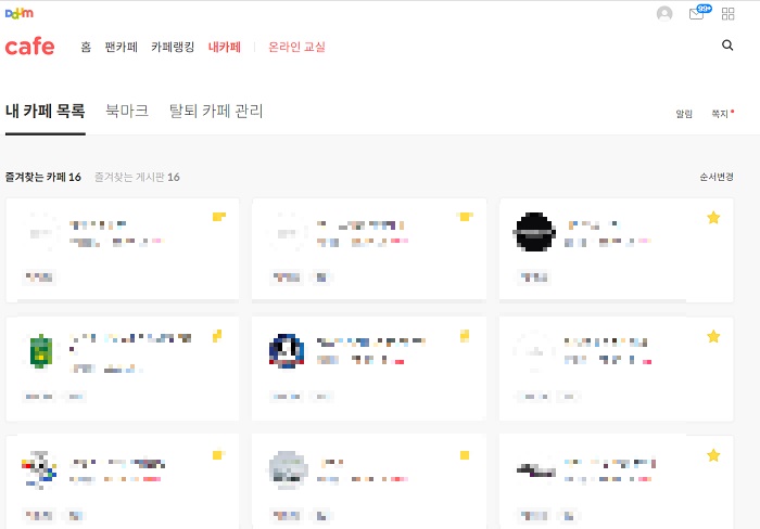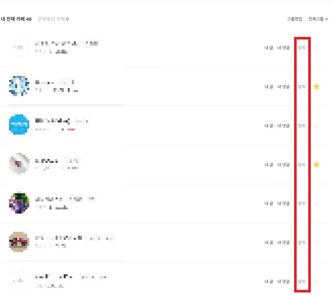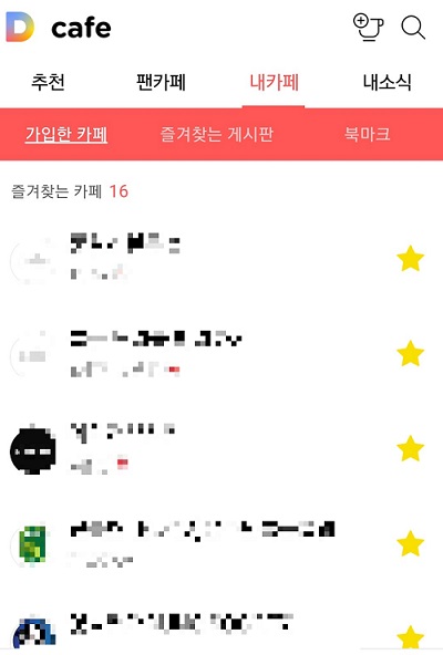 내 카페 목록이 쭉 있습니다. 여기서 먼저 즐겨찾는 카페가 나오는데요.
