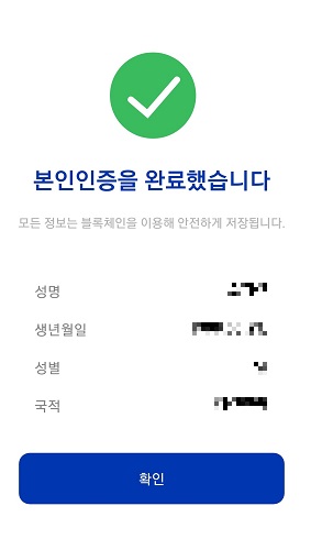 본인인증이 완료되면 자신의 성명과 생년월일, 성별, 국적 등이 나옵니다. 이제 코로나 19 예방 접종 확인 증명서를 받을 수 있는 조건을 갖췄습니다. 확인 버튼을 눌러 메인 화면으로 돌아갑니다.