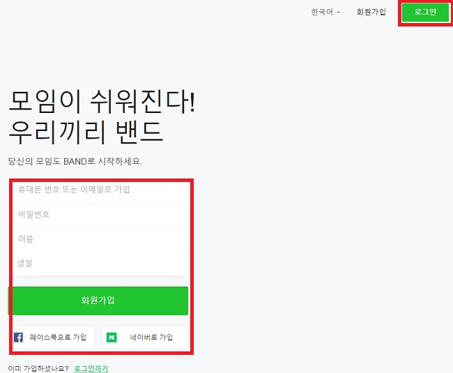 네이버 밴드 홈페이지를 가면 로그인 화면이 나옵니다. 회원가입이 안되어 있으신 분들은 네이버, 페이스북 계정으로 가입을 하거나 휴대폰 번호, 이메일 등으로 회원 가입 신청을 합니다. 이미 계정이 있으신 분들은 우측 상단에 '로그인' 버튼을 눌러주세요.