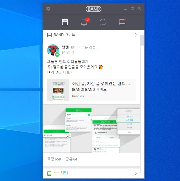 로그인을 하셨다면, 모바일 밴드 어플과 비슷한 화면이 나옵니다. 여기서 상단을 보시면 '데스크탑 버전 다운로드'가 있습니다. 해당 버튼을 눌러 다운로드 페이지로 이동합니다.