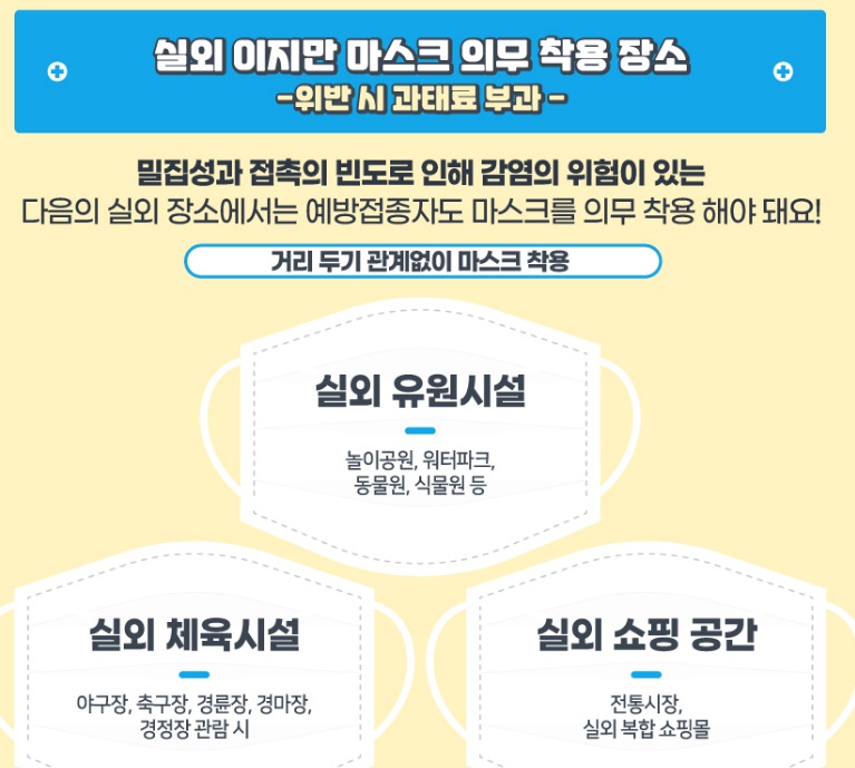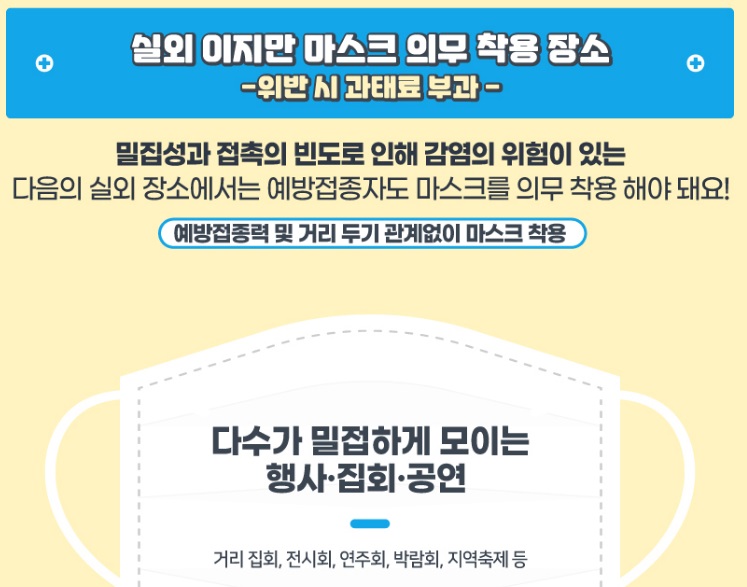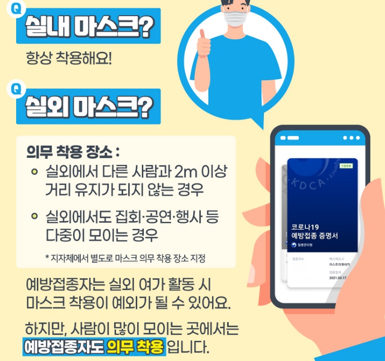 또한 예방접종자도 사람이 모이는 곳에서는 의무적으로 마스크 착용이 필요합니다.
