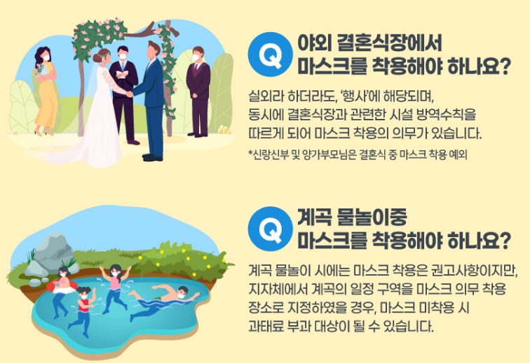 결혼식장과 계곡 물놀이 상황에서 마스크 지침도 꼭 확인 하세요.
