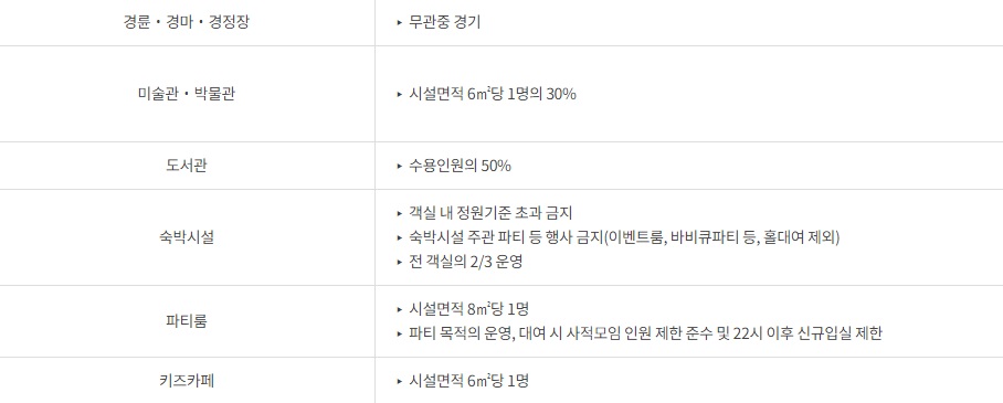 도서관, 박물관, 숙박시설등도 수용인원 기준을 낮췄습니다.