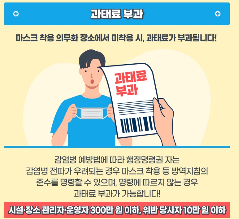 감염병 예방에 따라서 마스크를 제대로 쓰지 않는 방역 지침 위반자에게는 과태료를 부과할 수 있습니다. 시설 관리 운영자의 경우 300만원 이하, 당사자에게는 10만원 이하까지 과태료가 처분 될 수 있습니다. 과태료 지정 조건은 지자체 별로 상이하므로 해당 지역 내 지침을 잘 확인 할 필요가 있습니다.
