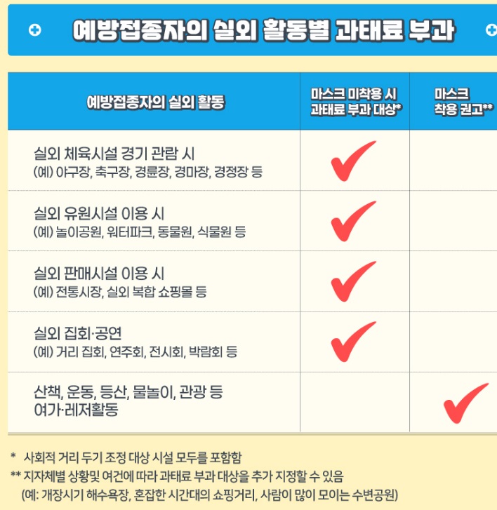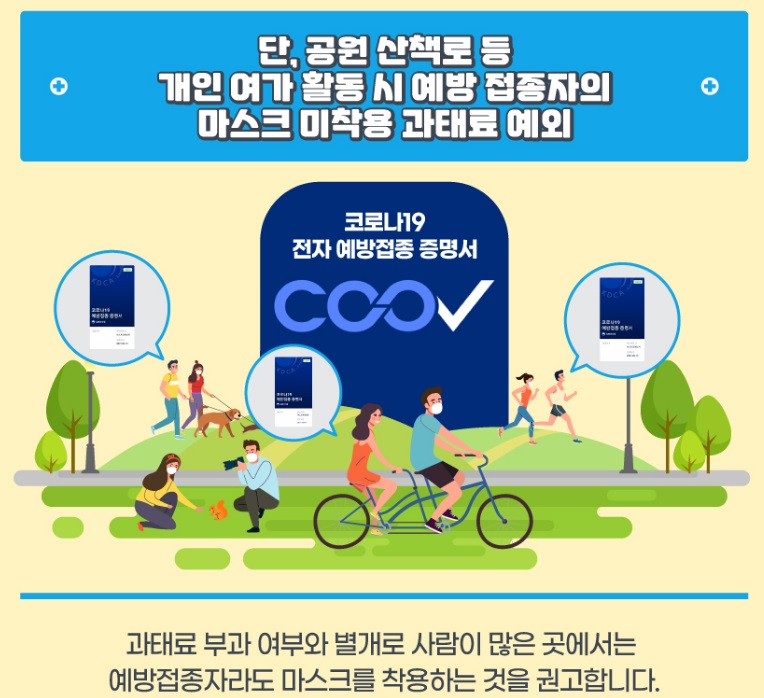 단, 공원이나 산책로 등에서 예방 접종을 받은 사람의 경우 마스크 착용을 하지 않아도 과태료가 나오지 않습니다. 다만 아직까지 많은 사람들이 백신 접종을 맞지 않았으므로 마스크 착용을 권고 하고 잇습니다.