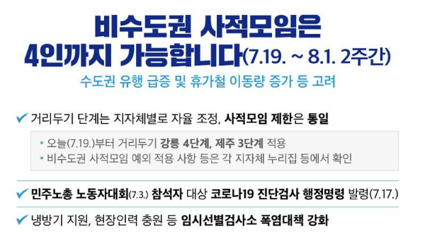 사회적 거리두기 새로운 지침에 따라 7월 19일 기점으로 비수도권 사적 모임은 4인까지 가능합니다. 또한 7월 3일 민주노총 노동자 대회 참석자 중 확진자가 나옴에 따라서 코로나 19 진단검사 행정명령이 발동 됐습니다. 참고 바랍니다.