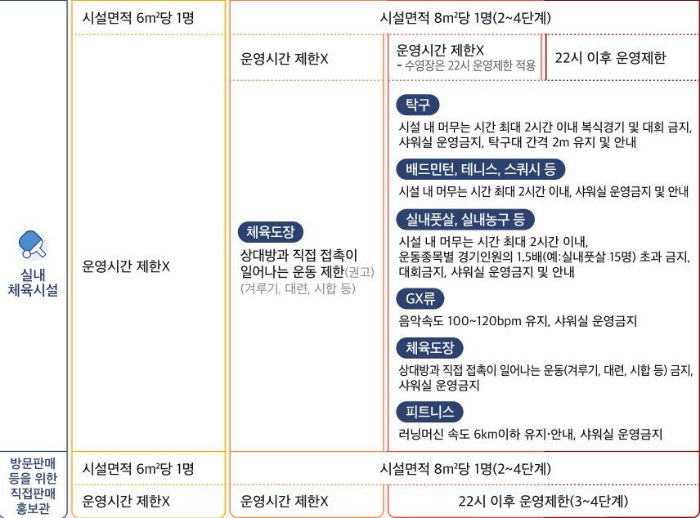 실내 체육시설은 22시이후 제한 운영을 2~4단계 동일하게 가져갑니다. 탁구, 풋살, GX 류등에는 거리두기와 시설 운영 지침 등에 관해 자세히 나와있습니다.