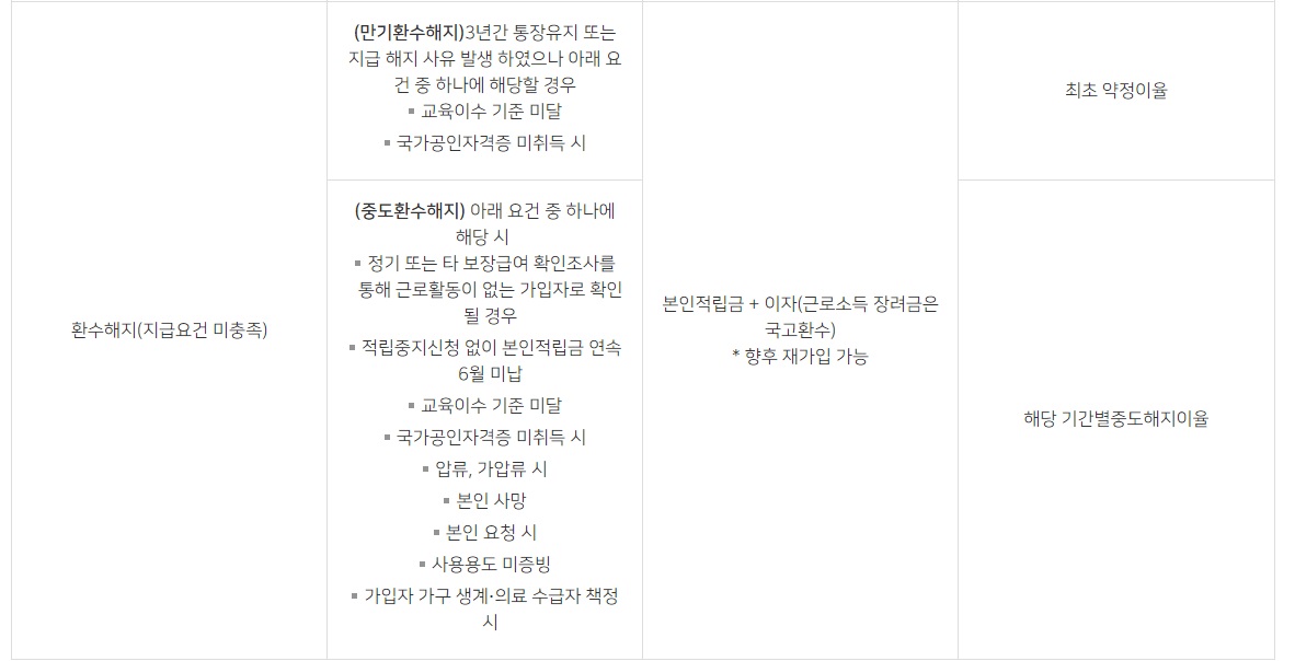 지급요건을 미충족 하면 만기를 했더라도 환수하게 됩니다. 교육 이수 기준 미달, 국가공인자격증 미취득이 대표 사유이며, 중도 환수해지는 근로활동 없는 사람, 교육 이수, 자격증 미취득, 압류, 본인 요청 등의 사유로 해지가 됩니다. 관련 약정 이율은 상황에 따라 다릅니다.