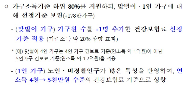 1인 가구의 경우에는 연소득 5천만 원 수준의 건강보험료 기준으로 상향, 맞벌이 가구는 기존 가구원수+1인 을 추가학 기준을 적용해서 지원이 확대됩니다.