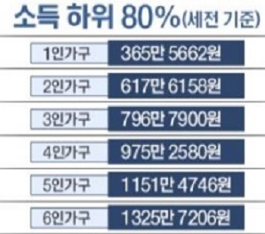 즉 4인 가구인데 기존 4인 기준으로 했을 때는 소득 하위 80%에 걸려 지원금을 받지 못했지만, 가구원수가 한 명 늘어난 5인 가구를 기준으로 하기 때문에 지원받을 수 있게 된 것입니다.