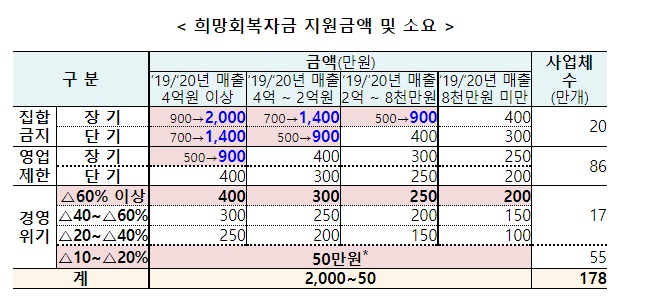 소상공인 피해지원 규모도 증가 했는데요. 예산은 5.3조 원이며 최대 2천만 원 까지 지원됩니다. 상세 지원 내용과 기준, 금액은 아래 확인하시기 바랍니다.