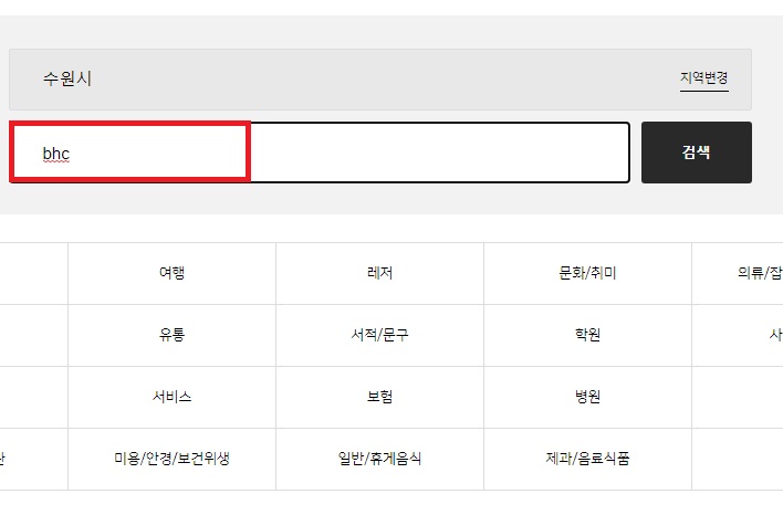 가령 내가 사는 곳이 수원이고 bhc 사용 가능 매장을 찾고 싶다면, 검색창에 매장 이름 치면 관련 매장과 주소들이 나옵니다. 또한 검색 밑에는 업종 별로 나누어서 조회가 가능하게 되어 있습니다.