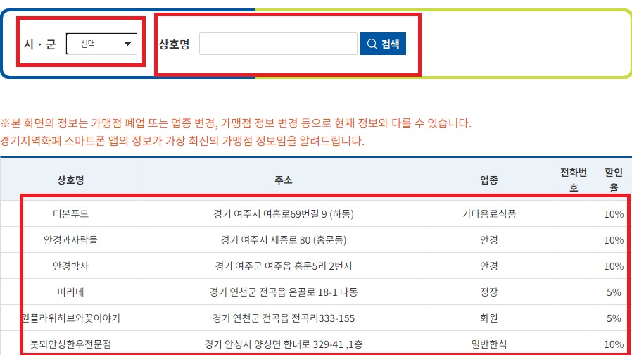 해당 시군 선택하고 상호명을 입력하면 됩니다. 가맹점 업종이 무엇인지와 할인율을 확인할 수 있습니다.