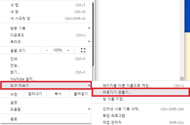 해당 부분에서 '도구 더보기' 그리고 '바로가기 만들기'를 눌러줍시다.