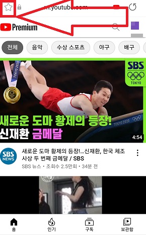 스마트폰에서 유튜브 홈페이지를 들어가서 왼쪽 상단에 보이는 별표 모양을 누르면 즐겨찾기, 북마크에 추가가 됩니다.