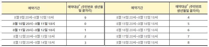 - 즉, 생년월일 끝자리가 2인 사람은 8월 12일 20시부터 다음날 13일 18시까지 예약 신청 가능