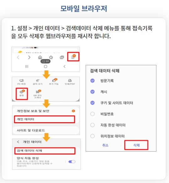 - 검색 데이터에서 방문 기록, 캐시 삭제 후 다시 신청
