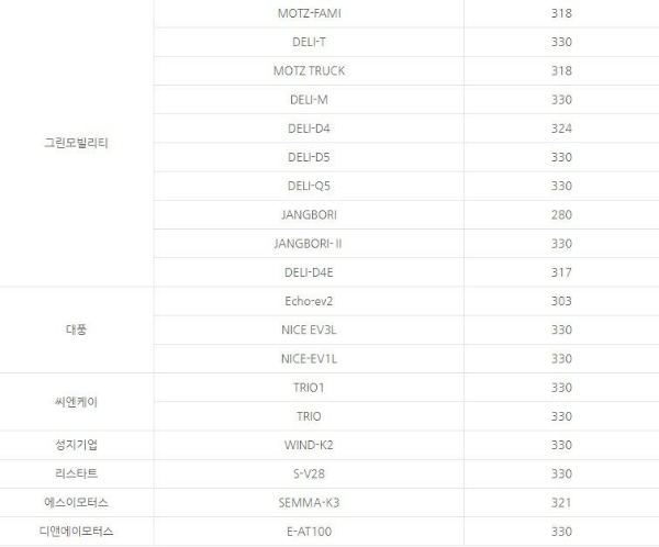 - 제조사 : 기아 대창모터스 르노삼성 벤츠코리아 쌍용자동차 쎄미시스코 쎄보모빌리티 재규어 케이에스티일레트릭 테슬라 한국GM 한불모터스 현대 BMW - 제조사 : 기아자동차 대창모터스 디피코