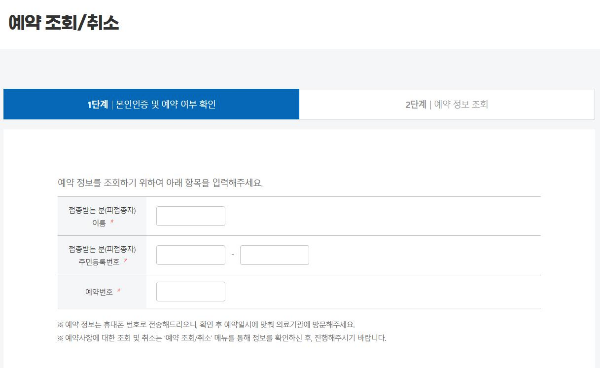 코로나 19 사전예약 시스템에서 예약을 한 후, 급작스러운 마음의 변동이나 상황이 좋지 않아 사전예약을 포기하는 경우도 있을 겁니다. 이럴 때는 예약정보를 확인한 뒤에 예약번호를 통해 내 정보를 조 회화 거나 취소가 가능합니다.