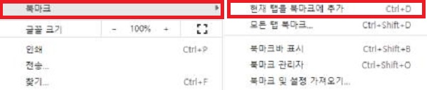 북마크에서 '현재 탭을 북마크에 추가' 버튼을 누르면 현재 페이지가 북마크, 즉 즐겨찾기에 추가됩니다.