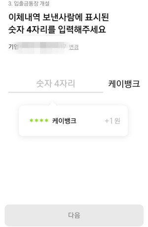그리고, 본인 인증을 하기 위해서 본인 명의 다른 계좌 인증을 진행합니다. 은행과 계좌를 입력하면 1원 입금과 함께 이체내역에 숫자가 나옵니다. 해당 숫자를 보고 4자리 입력해주시면 본인 확인 절차가 마무리됩니다.