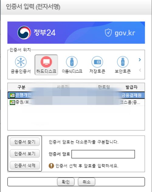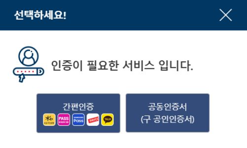 공동 인증서를 선택해서 인증서 암호를 입력합니다. 혹은 다른 간편 인증을 진행합니다.