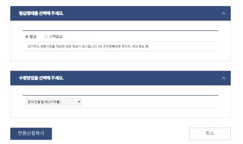 발급, 선택 발급 두 가지로 나뉩니다. 차이는 '발급'을 선택하면 과거에 주소를 변경한 것을 제외하고 모든 정보를 표시하는 것입니다. 예를 들어 주민등록번호 뒷자리나 세대원 정보까지 포함이 되는 것이죠. 제출 용도 등을 고려해서 본인이 두 가지중 하나를 선택하시면 되겠습니다.