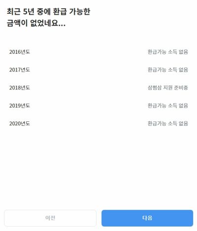 최근 5년간 소득이 나오고 환급 가능한 금액을 조회할 수 있습니다.
