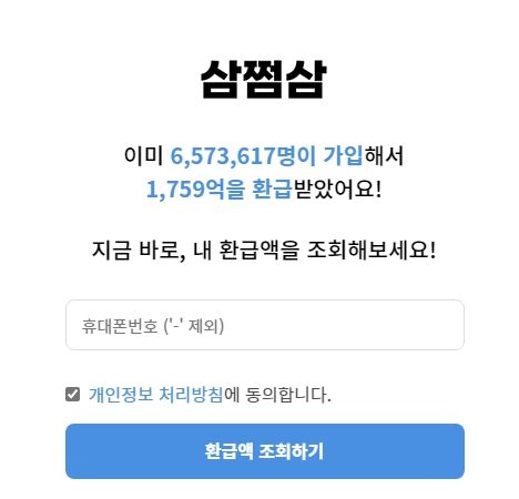 사이트 접속 후에 휴대폰 번호 입력, 개인정보 처리방침에 동의 후에 '환급액 조회하기'를 누릅니다.