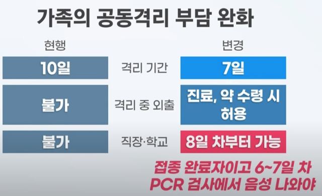 격리 해제는 기존 10일에서 7일로 변경 됐습니다. 백신 미접종자의 경우 10일을 유지합니다. 또한 진료나 약 수령 목적으로 할 때 외출도 가능합니다. 직장이나 학교는 8일차 부터 가능한데 이 조건도 역시 접종완료자이고 PCR검사에서 음성이 나온 사람만 해당됩니다.